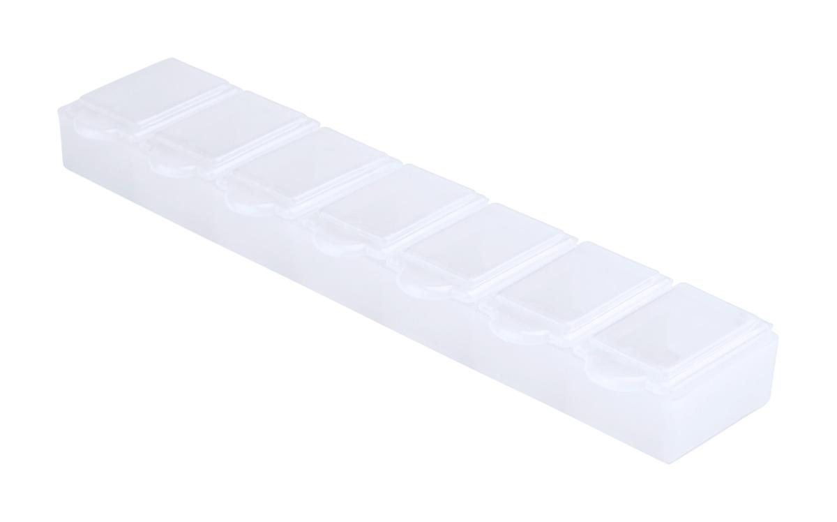 Plastový, týdenní box na pilulky, se 7 přihrádkami.