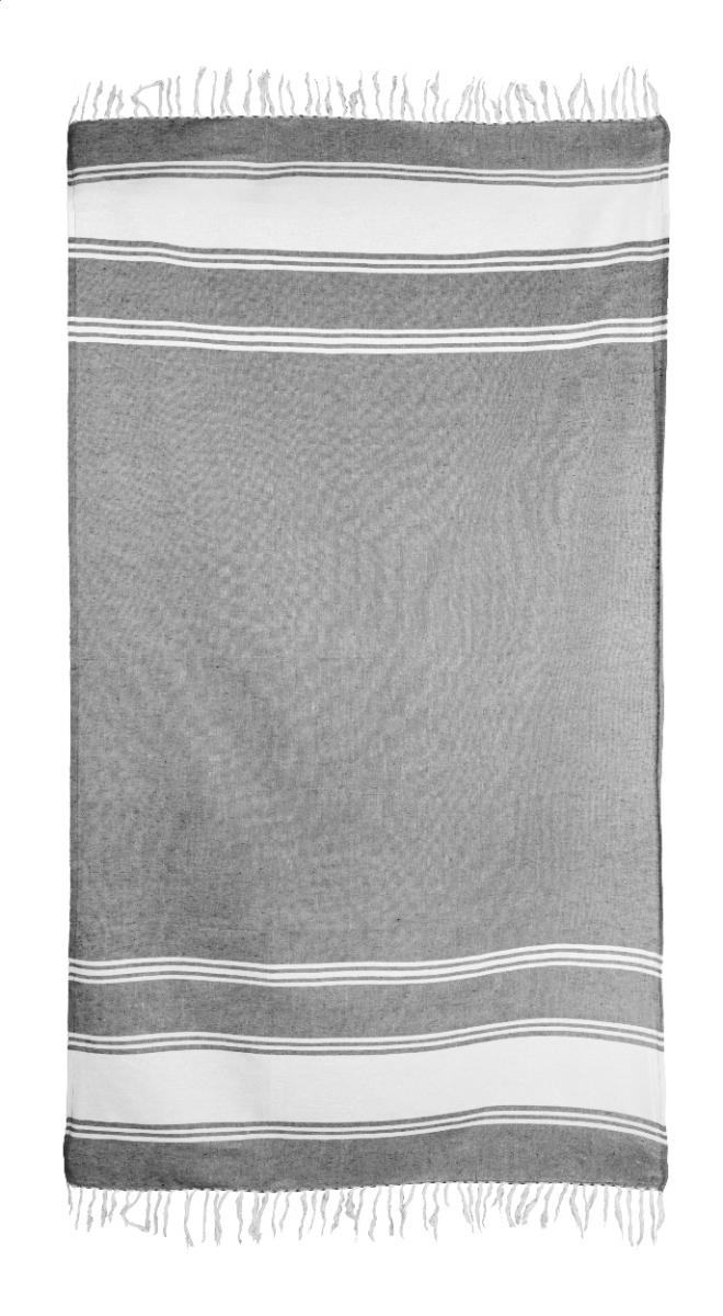 Dvoubarevný pruhovaný plážový ručník pareo ze 70% bavlny a 30% polyesteru. 210 g/m².