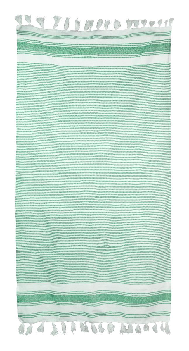 Dvoubarevný pruhovaný plážový ručník pareo ze 70% bavlny a 30% polyesteru. 210 g/m².