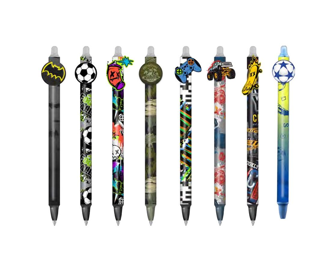 praktická gumovatelná pera pro děti s motivy, kvalitní inkoust lze v případě potřeby jednoduše vygumovat a přepsat, 8 různých motivů, barva náplně: modrá, šířka stopy: 0,5 mm, stiskací mechanika, dostupná náhradní náplň