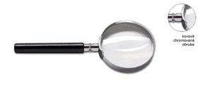 Lupa s kovovým rámečkem a skleněnou čočkou. Rozměry: průměr 75 mm, výška 12 mm, délka 17 cm.